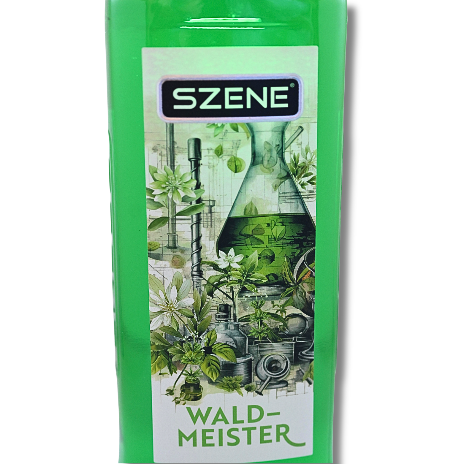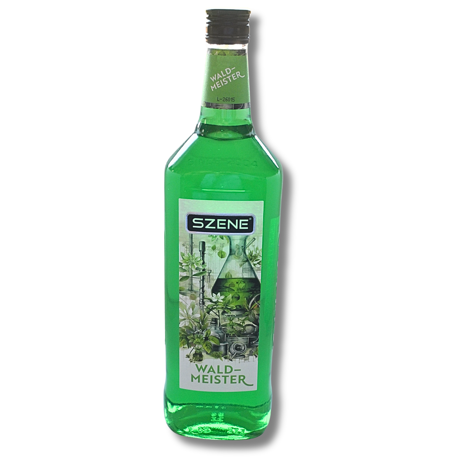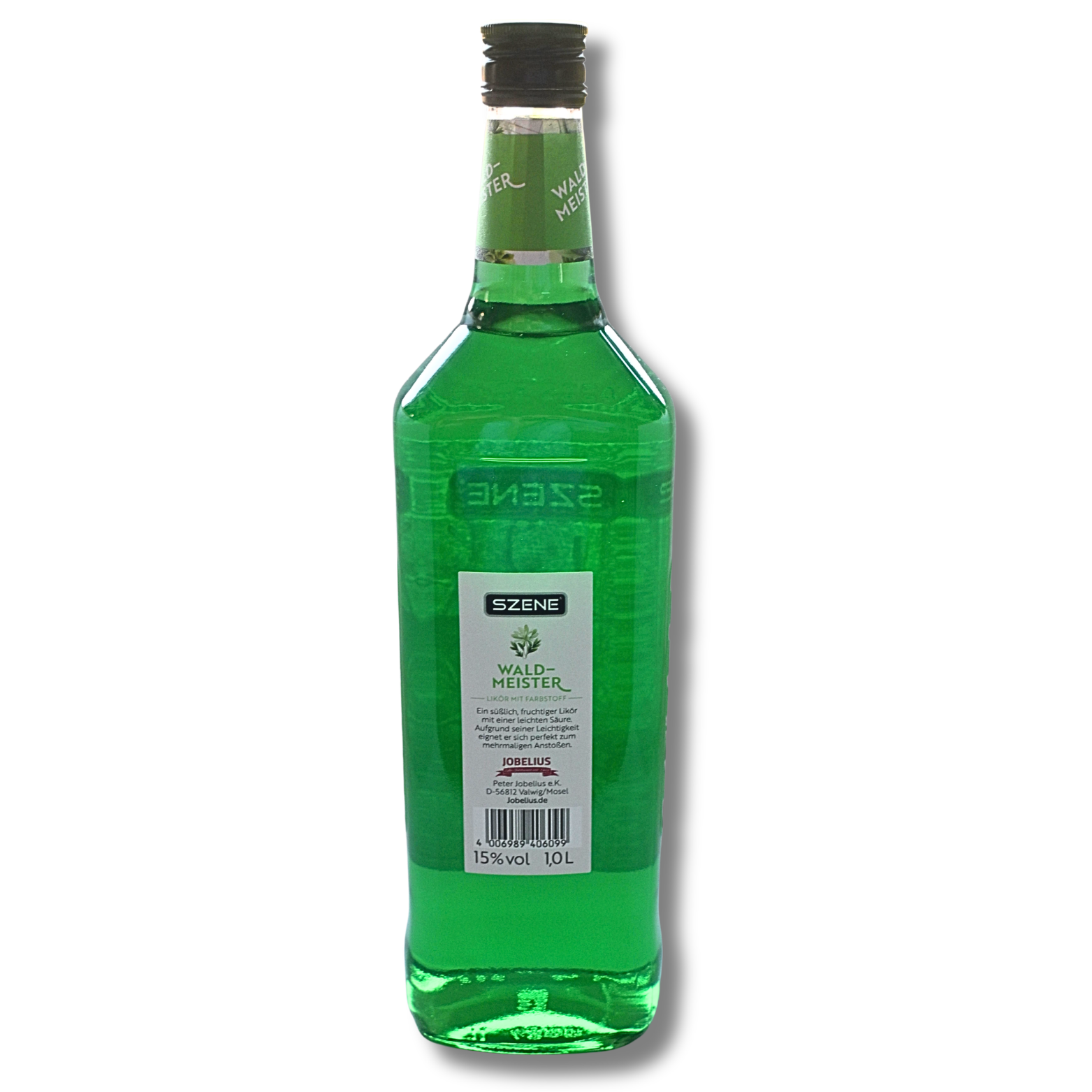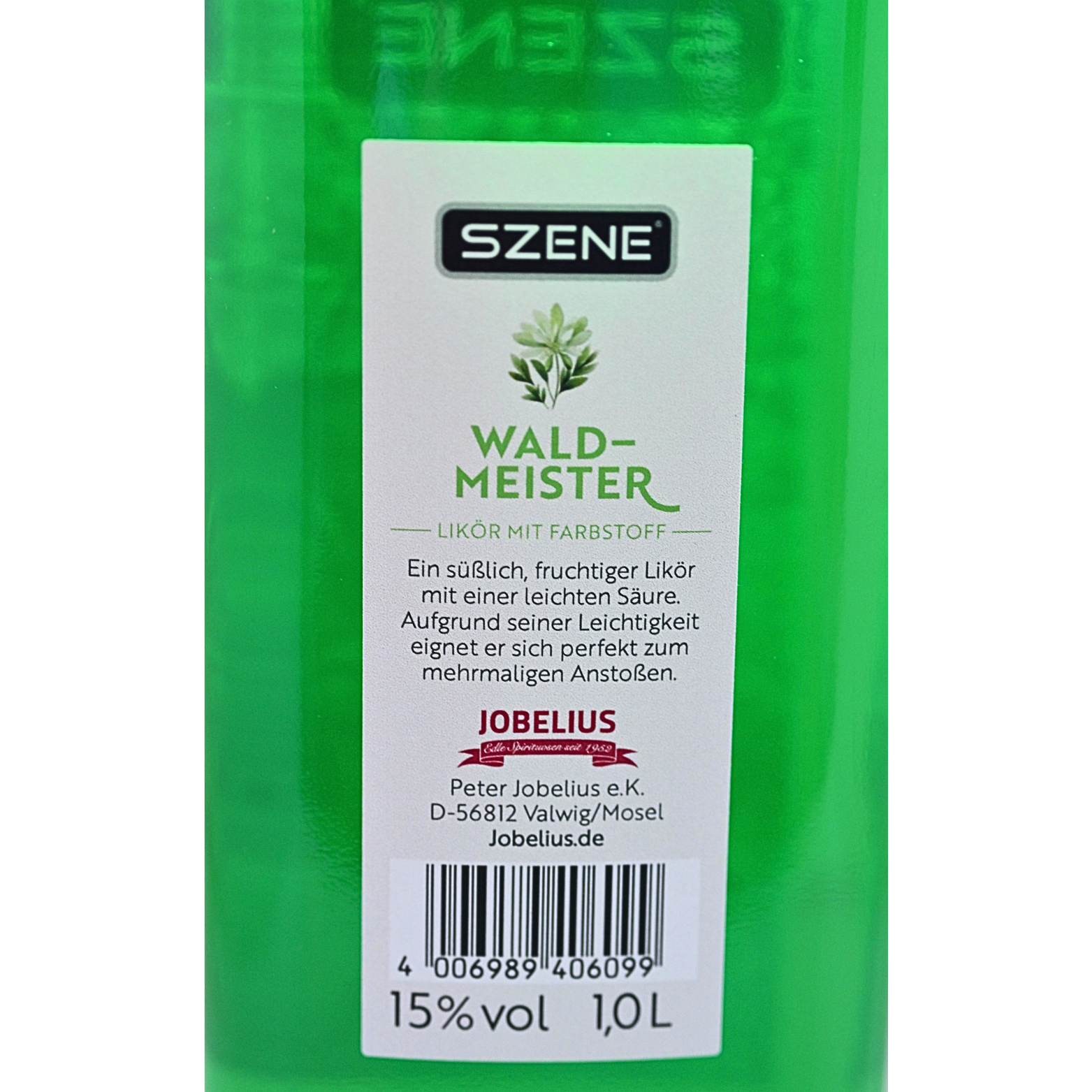 Deutscher Waldmeister Likör von Szene und Inverkehrbringer Peter Jobelius eK von der Mosel mit leuchtend grüner Farbe und charakterstarkem Kräuterprofil.